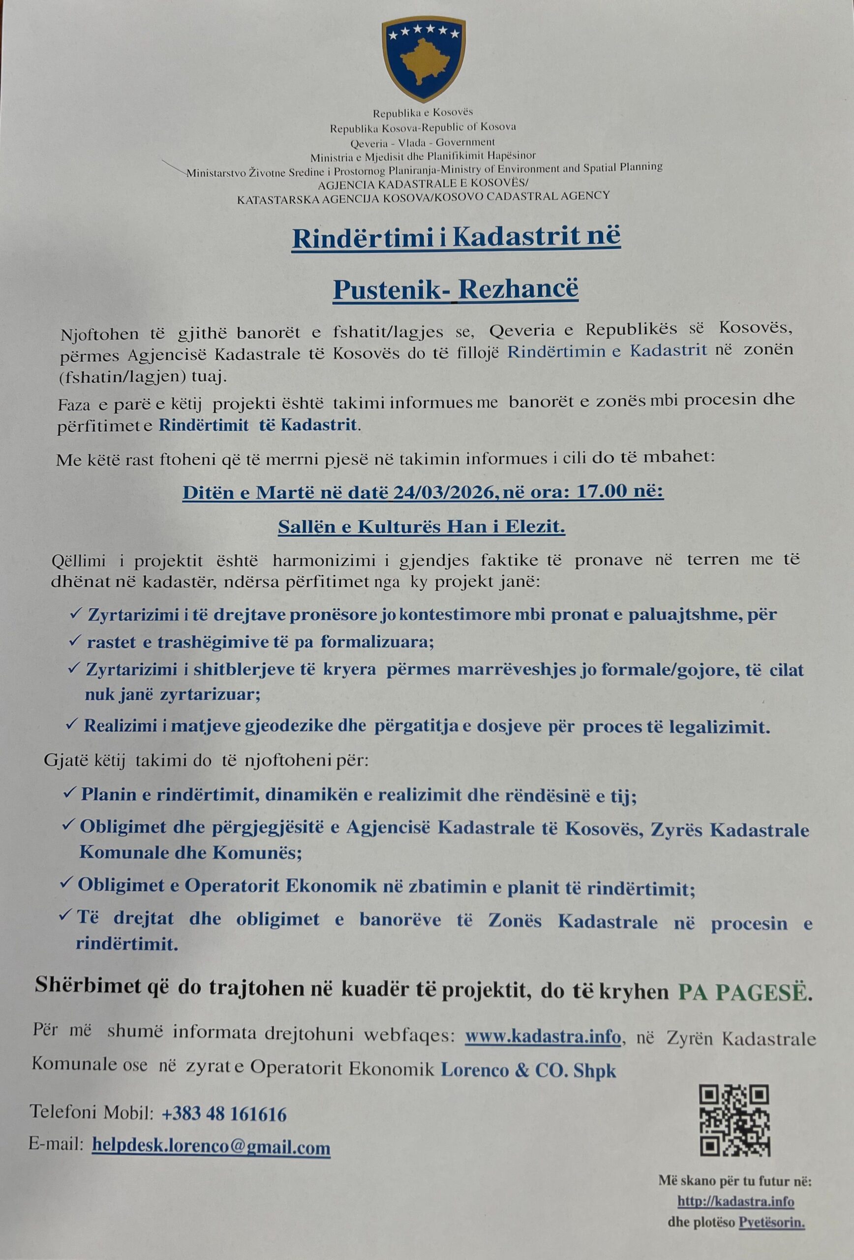 Komuna e Hanit të Elezit njofton qytetarët se ka filluar zyrtarisht procesi i rindërtimit të Kadastrit në Zonën Kadastrale Pustenik – Rezhancë.