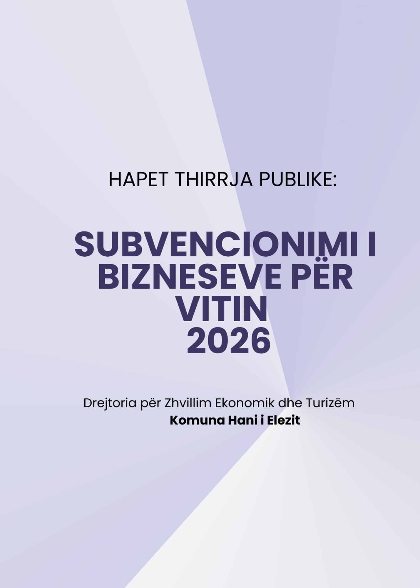 🏛️ Drejtoria për Zhvillim Ekonomik dhe Turizëm në Komuna Hani i Elezit hap Thirrjen Publike për mbështetjen e bizneseve start-up dhe bizneseve ekzistuese për vitin 2026.